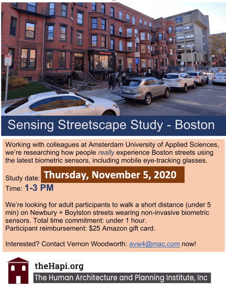 Participate in this important study promoting the research we do at geneticsofdesign.com working with the non-profit theHapi.org; it’s a great chance to try out eye-tracking glasses and really see what your body’s doing subliminally as you walk down a street! Contact Vernon above for more info and to sign up. We still have a few spots left – and this week the weather’s supposed to be good!