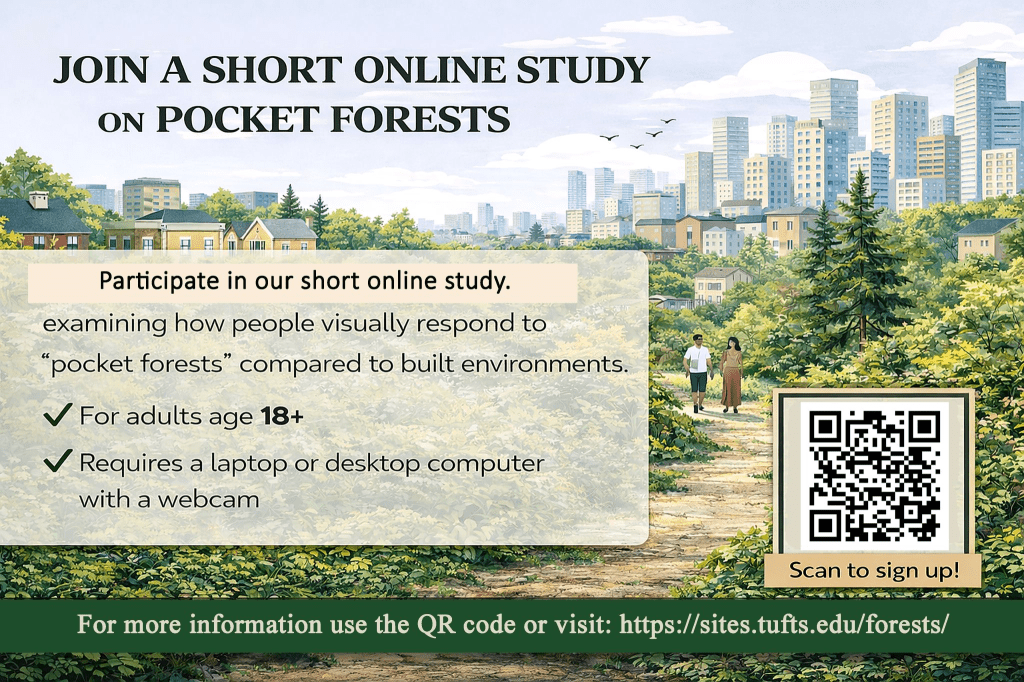 Tufts University’s Urban Attitudes Lab invites adults (18+) to join a short online study comparing visual responses to pocket forests in built environments.