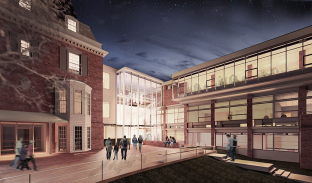 And what about the new addition? The new tall, glassy construction, may never elicit the same behavior from alums, whether five, ten or fifty years from now. No matter how appropriately appointed the interior educational spaces turn out to be, the primal pattern isn’t there. It doesn’t have a distinct ‘face.’