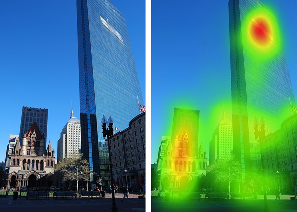 This photo shows the eye-tracking test environment at IHCD. The study volunteer (on the left) views photos on her monitor while an IHCD staff member watches the test computer with eye-tracking analysis software installed.Below are a few of the test results from Copley Place, one of Boston’s famed public spaces. The photos show Trinity Church (1877, by HH Richardson), a famed Romanesque building next to IM Pei’s landmark skyscraper, today called 200 Clarendon (formerly the Hancock Tower) built in 1976.
