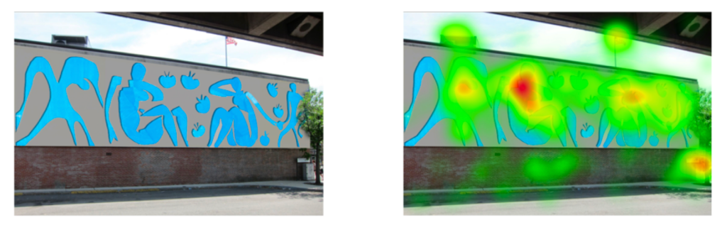 The images above, from our research, show the exit area outside the Davis Square subway station in Somerville, Massachusetts, as it exists today (at bottom) and how it might look with added art (images at top). Eye tracking—aggregating visual data to create ‘heat maps’—glows brightest and reddest where people look most. Here the heat maps show that people barely look at the wall exiting the subway, in a brief, 15-second testing interval, but with the added art they would behave much differently. They would likely approach or even linger in front of the art-filled wall and, significantly, perhaps even focus on the area long enough to create a memory of the moment.