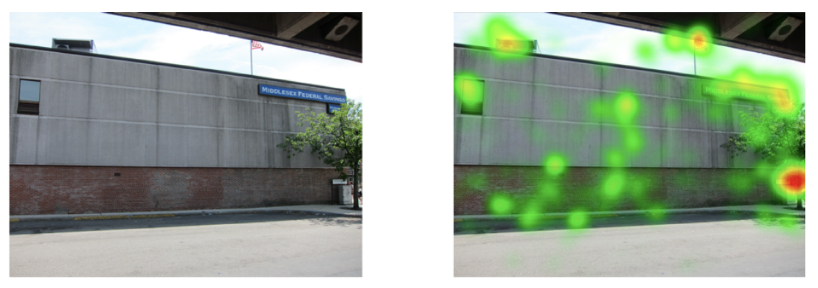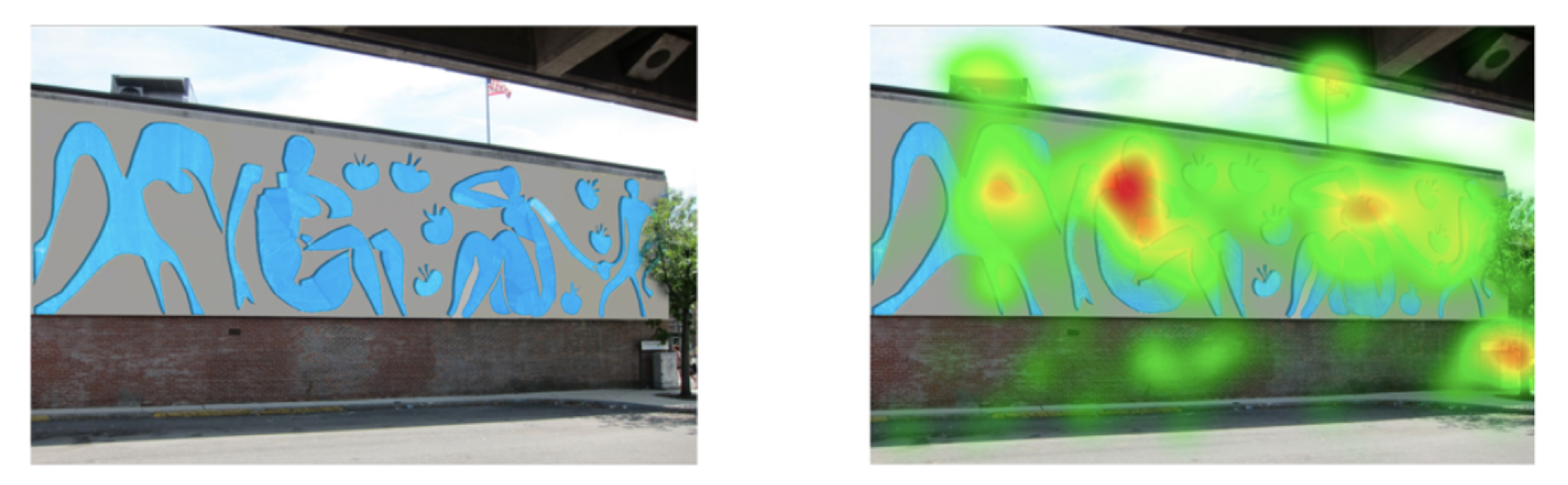 The images above, from our research, show the exit area outside the Davis Square subway station in Somerville, Massachusetts, as it exists today (at bottom) and how it might look with added art (images at top). Eye tracking—aggregating visual data to create ‘heat maps’—glows brightest and reddest where people look most. Here the heat maps show that people barely look at the wall exiting the subway, in a brief, 15-second testing interval, but with the added art they would behave much differently. They would likely approach or even linger in front of the art-filled wall and, significantly, perhaps even focus on the area long enough to create a memory of the moment.