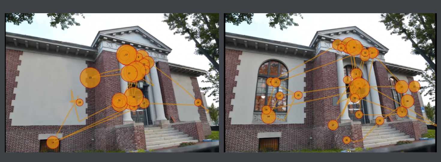 Eye tracking is fantastic at deconstructing how our experience of architecture happens without our awareness, depending on what’s in front of us. In the images above, for instance, we found people implicitly look at this library differently if it has windows. With windows, the eyes take in the façade fairly evenly; without windows (we Photoshopped them away) people ignore most of the building except its door. In these images, the yellow dots, represent fixations, spots where the eyes focus, and the lines between, saccades, tracking the movements between focal points. When asked where they’d rather wait, people always respond in front of the building with windows, and they won’t know why. (But we have an idea; the added fixations the windows provide subliminally make people feel more secure in front of the fenestrated façade.)