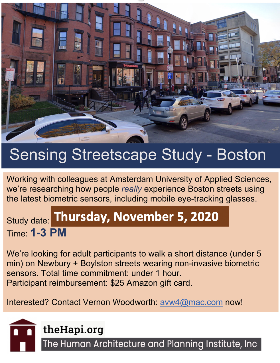Participate in this important study promoting the research we do at geneticsofdesign.com working with the non-profit theHapi.org; it’s a great chance to try out eye-tracking glasses and really see what your body’s doing subliminally as you walk down a street! Contact Vernon above for more info and to sign up. We still have a few spots left – and this week the weather’s supposed to be good!
