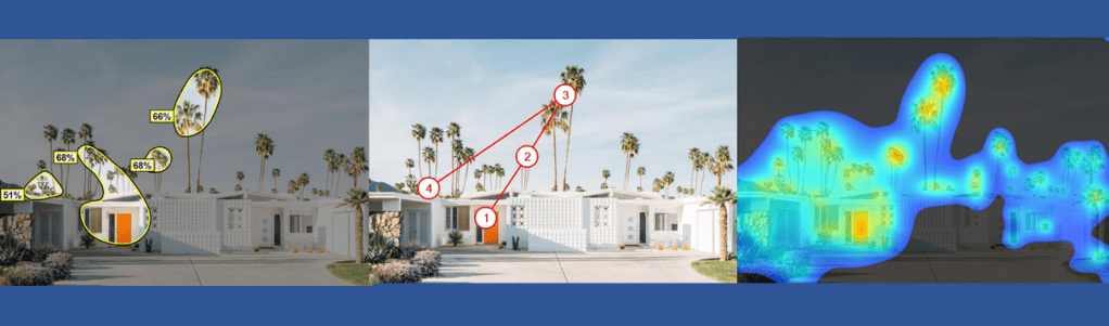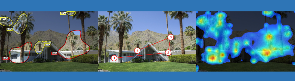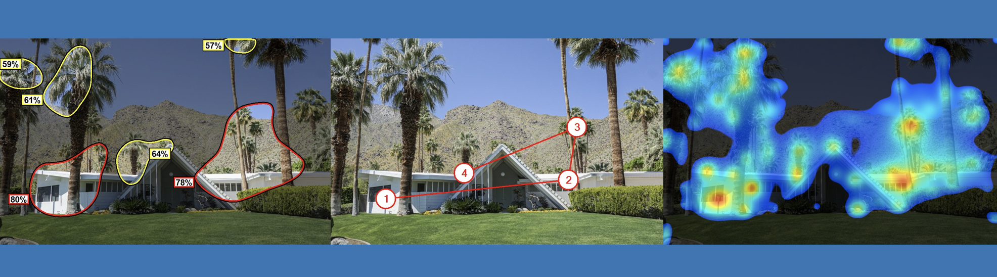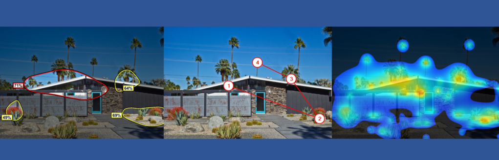 This shows a mid-century modern house in Palm Springs, CA, run through biometric software which reveals how people take in a scene at-first-glance, or in the first 3-to-5 seconds which is before conscious viewing comes online. The Region-of-Interest (ROIs) diagrams, circled in red and yellow, at left, indicate how the trees and rooflines will capture the most attention, 57-to-78% of it; the Visual Sequence diagram, center, predicts the order in which the surrounding trees will draw the eye; and the heat map, above right, aggregating vision data and glowing red where people look most and fading to black in areas ignored, indicates people will predominantly focus beyond the house rather than at it.