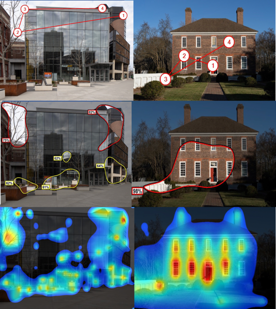Traditional architecture, and just about all architecture built before modernism took over, post-WWI, is however, the opposite – approachable. Our ancient brain architecture, which hasn’t changed in 40,000 years, directs us to look right at traditional buildings and in most instances, instantly find the front door. You can really see that in contrasting photos below, run through the same biometric software (3MVAS), comparing a modern art college in Boston, (Mass College of Art) with historic architecture in Williamsburg, Virginia. In this study, put together by design student Becky Chen, at the Boston Architectural College (BAC), note again how the brain directs the eye around the modern building and toward the sky – again! – while the opposite phenomenon happens with the classical building; the brain is directed immediately to its front door! And these subliminal behaviors matter – indeed, we make the case they are hugely significant, because they provide the foundation for all our subsequent conscious behavior and actions.
