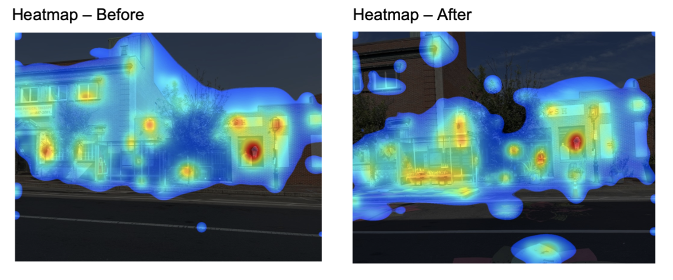Heatmaps glow brightest in areas that get the most attention, fading to blue in areas receiving less and then black in areas getting none. Note how sidewalk and roadway, at left, near the bus stop are almost all black, before intervention, and are less so, at right, after.