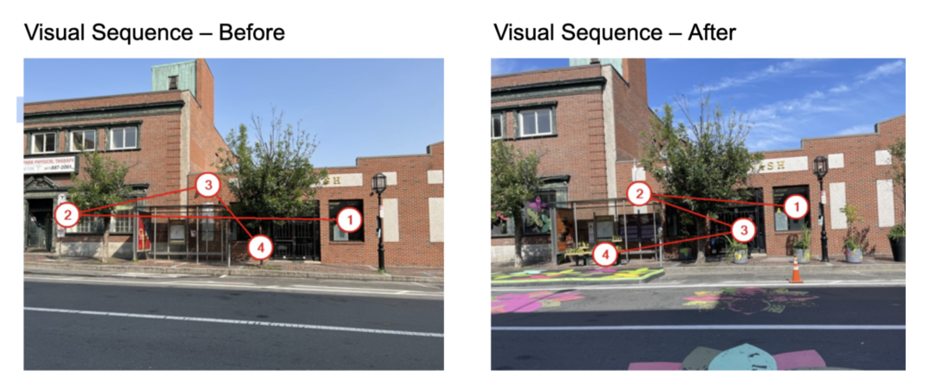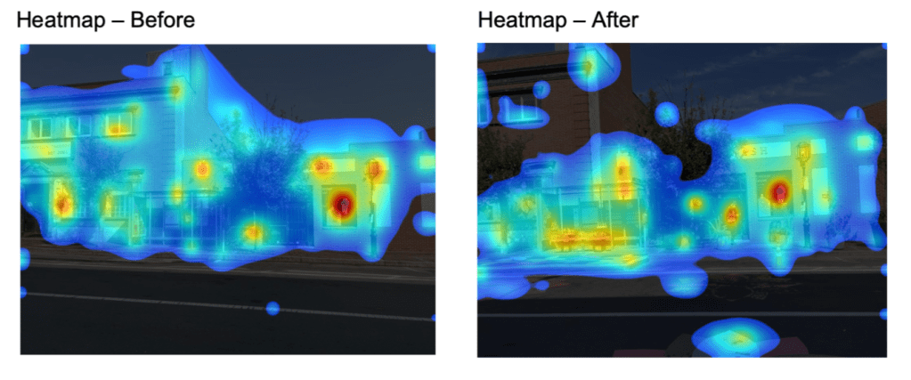 Human visual perception happens in two phases; the first phase, during the first 3-to-5 seconds is driven by non-conscious visual processing triggered less than a second after we look at any ‘scene.’ VAS predicts how the brain has us take-in our surroundings in this first phase. Note, here, how the eyes focus around the bus stop rather than on it before the intervention, and directly on the bus stop after, with sequence 2 and 4 falling on the bus stop’s roof and bench.