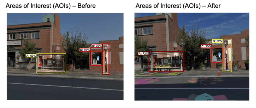 Area of Interest diagrams (AOIs), as shown below, drawn around specific areas to study, suggest how the artful bus stop draws attention away from the street light nearby. Before the intervention the street light attracted 76% of views and the bus stop only 60%; after the intervention, the bus stop gets 72% of views and street light views fall to 62%.