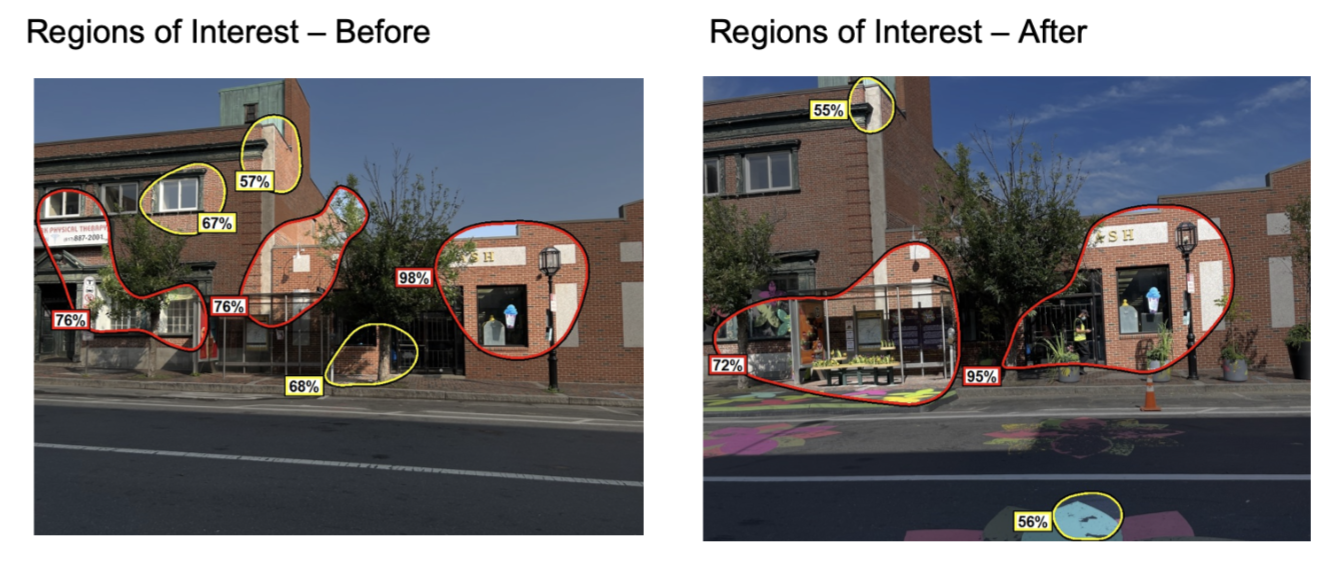 The Regions of Interest (ROIs) diagrams, outlining in red where highest percentage of views likely fall, show attention goes to areas around the bus stop, rather than on it, before the intervention – and how things really do shift afterwards, with 72% of views falling directly on the bus stop with its added flower art.