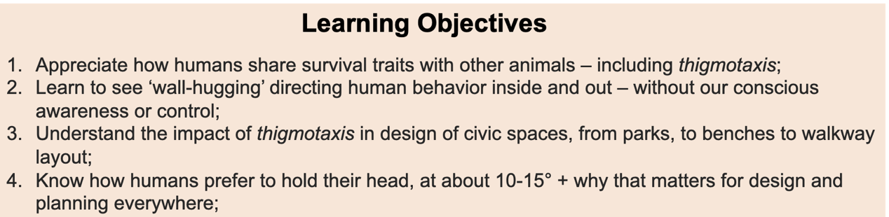 It will discuss Thigmotaxis, how humans are ‘Wall-Huggers’ – hardwired to seek out edge-conditions for safety + orientation without conscious awareness or control!